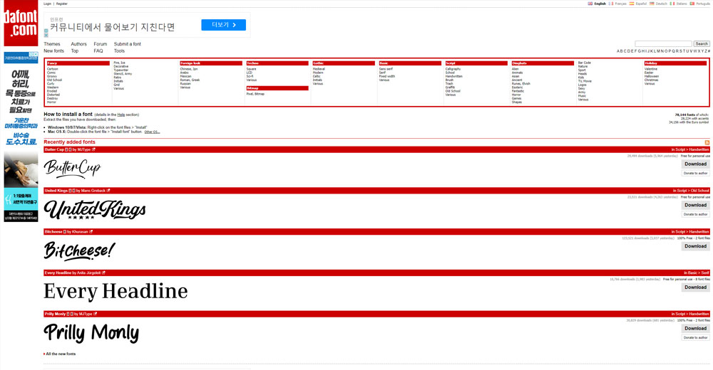 DaFont는 무료 폰트뿐만 아니라 특수한 테마나 스타일의 폰트를 찾는 데 좋은 사이트입니다. 이 사이트의 폰트 중 일부는 개인 사용만 무료이므로 사용 전에 라이센스를 확인하는 것이 중요합니다.