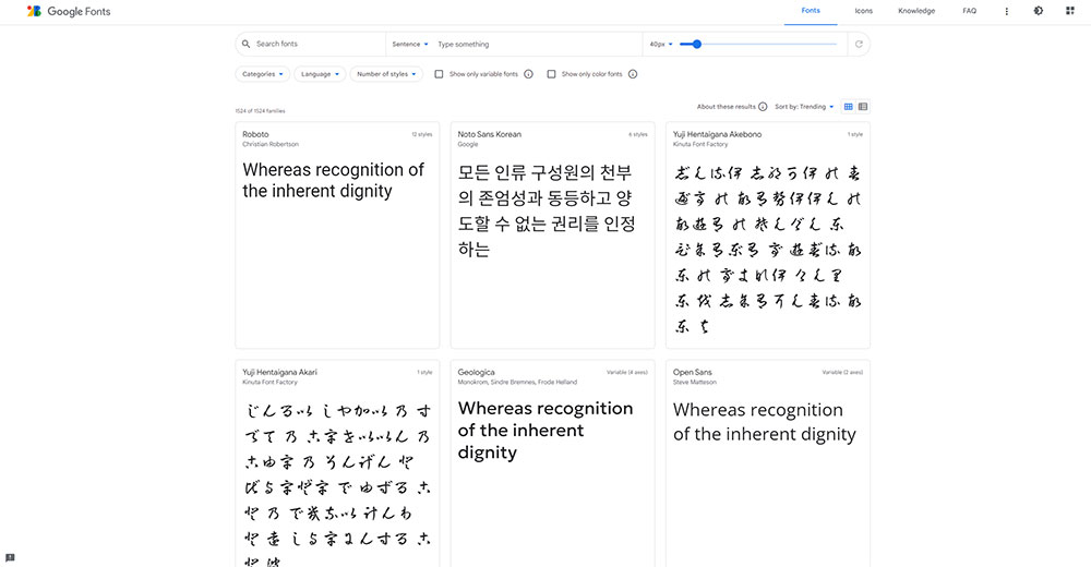Google Fonts는 수백 가지 이상의 무료 폰트를 제공합니다. 모든 폰트는 오픈 소스로 제공되며, 웹사이트에 바로 적용하거나 다운로드하여 사용할 수 있습니다. 그러나 한글 폰트의 경우 선택지가 다소 제한적일 수 있습니다.