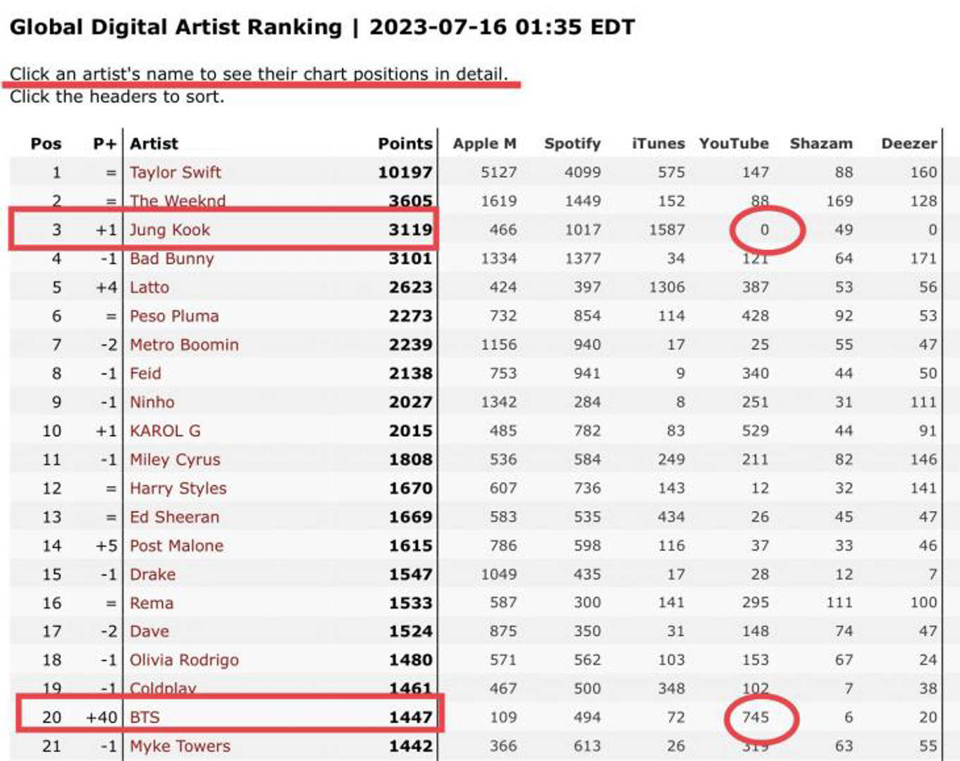 48시간만에 5천만 조회수를 기록한 정국의 'SEVEN'에 대한 글로벌 디지털 아티스트 유튜브 점수가 0임이 확인되어 논란이 되고 있습니다. kworb.net에서 제공한 자료에 따르면 (미동부시각 16일 오전 1:35 기준), 글로벌 디지털 아티스트 랭킹 3위에 오른 정국의 유튜브 수치가 제로로 표시되고 있습니다. 한편, BTS의 유튜브 수치는 745로 1위를 차지하고 있으며, BTS의 아티스트 순위 역시 40위 상승한 것으로 나타났습니다. 이는 정국의 뮤직비디오 조회수가 정국 대신 BTS에 반영된 것으로 예상됩니다.