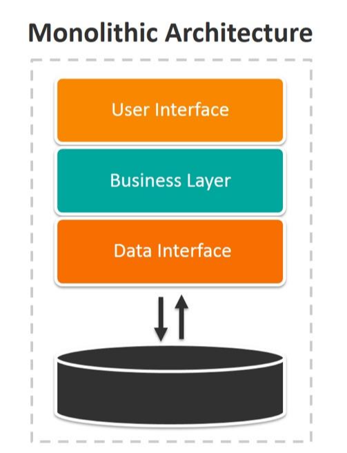 모놀리식 아키텍처는 단일 코드 베이스의 애플리케이션이다. 예를 들어 Java로 작업할 때, 전체 애플리케이션은 단일 데이터베이스에 연결된다. 이것은 매우 일반적인 접근 방식으로, 거의 모든 개발자가 코딩을 시작할 때 이런 종류의 아키텍처에서 작업을 하게 된다. 그래서 모놀리식으로 개발한 어플리케이션은 구현이 쉽고, 덜 복잡하다는 장점이 있다.