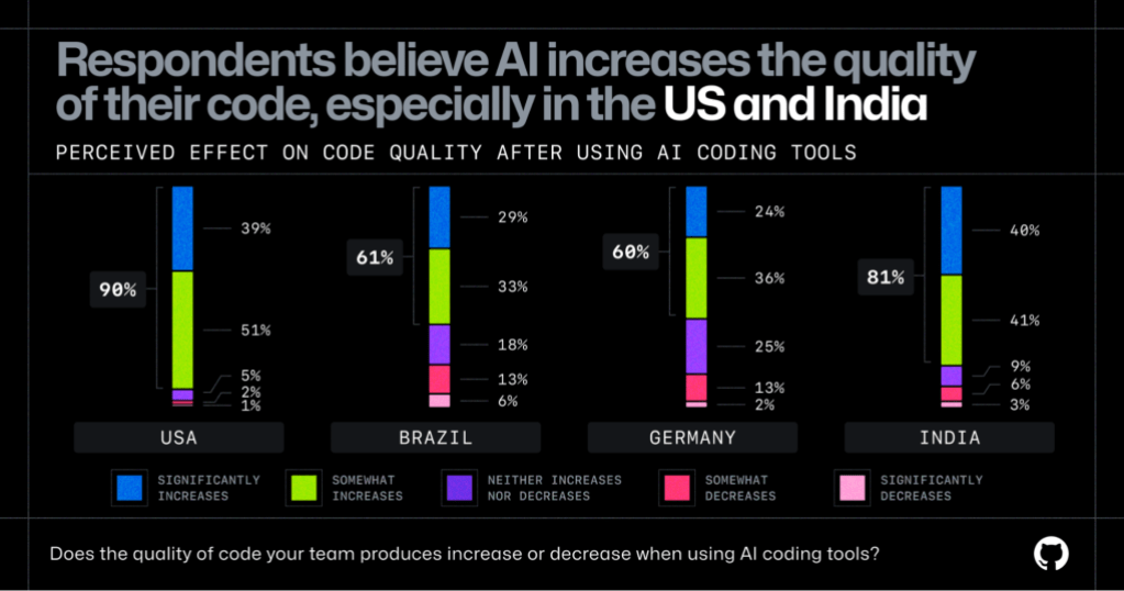 - 이전보다 AI 코딩 도구를 사용할 때 코드 품질이 향상되었다고 미국(90%), 인도(81%), 브라질(61%), 독일(60%)로 답했다.