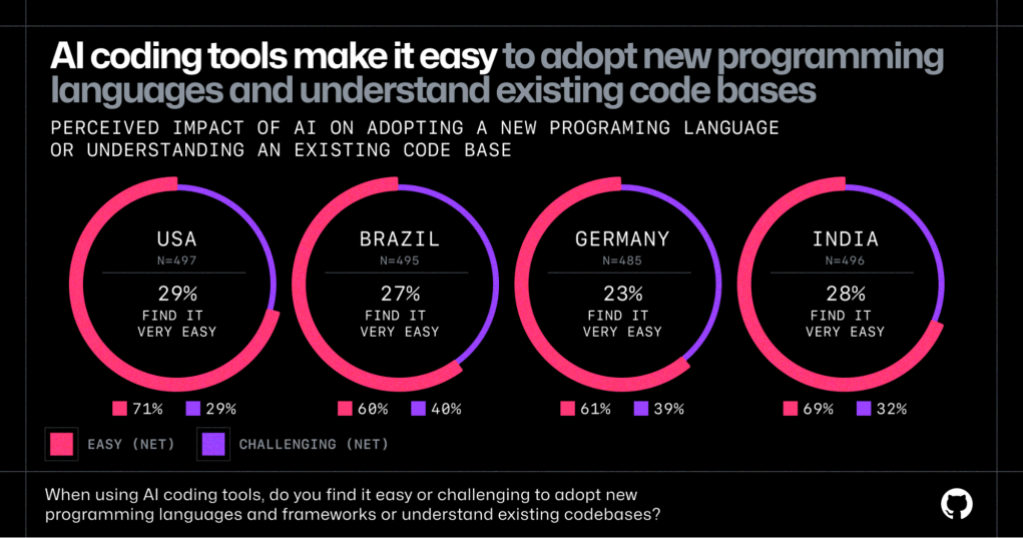 - 응답자 60~71%는 AI 코딩 도구를 사용하면 새로운 프로그래밍 언어를 채택하거나 기존 코드베이스를 이해하는 것이 "쉬워진다"라고 답했다. 특히, 국가별로 23-29%의 응답자가 AI 코딩 도구를 사용하여 응답자가 새로운 프로그래밍 언어를 채택하거나 기존 코드 기반을 이해하는 것이 "매우 쉽다"라고 답했다.